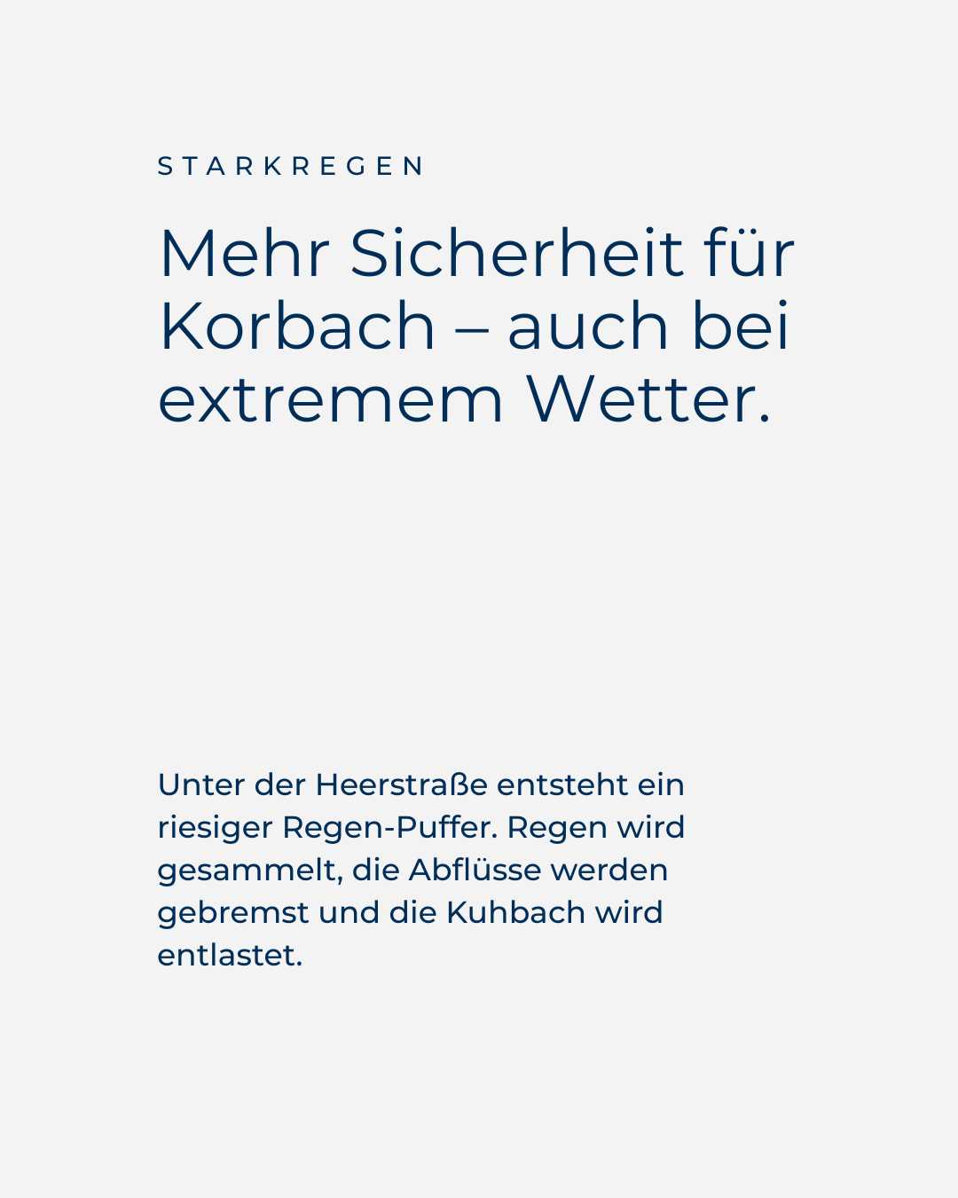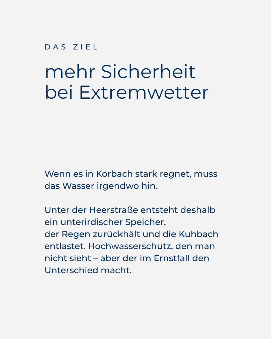 Um das Gewässer "Kuhbach" in der Kernstadt Korbach bei Starkregenereignissen zu entlasten, entsteht in der Fahrbahn der Heerstraße ein unterirdisches Regenrückhaltebauwerk. Das Gesamteinzugsgebiet des RRB beträgt ca. 12 ha und umfasst dabei Wohngebiete sowie die innerörtlichen Kreis- und Landesstraßen.In Zusammenarbeit mit der Fa. Aco und der Stadt Korbach wurde dafür ein 1.300 m³ großes Regenrückhaltebauwerk geplant.